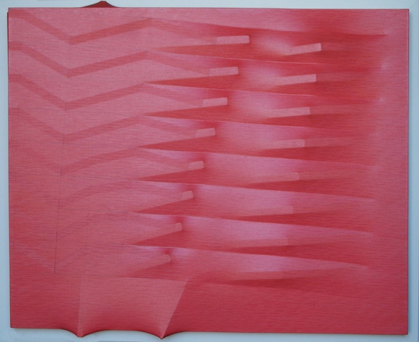 Per BONALUMI gli anni Ottanta sono il momento di riflessione sulla propria identità di “pittore” (definizione che amava darsi): le superfici estroflesse si animano di una sensibilità cromatica divisionista, fatta di tratti giustapposti di colore. Nell’opera in mostra, Rosso del 1987 (anch’essa esposta alla Mathildenhöhe di Darmastadt), i rapporti di luce/ombra s’intridono di sfumature aranciate: il fondamentale rapporto tra dato reale e dato percettivo si spinge talmente verso quest’ultimo, da spostare l’estroflessione oltre il bordo della quadratura dell’opera, che persino si stacca dalla parete mediante un asimmetrico controtelaio.