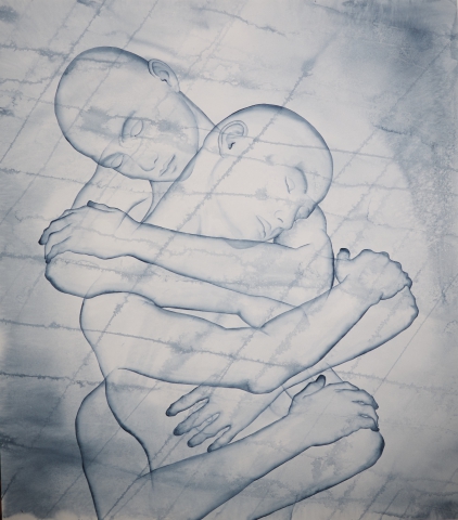 La Coesistenza è sia emotiva che sentimentale, e all’enunciato dei titoli corrispondono altri corpi e membra che si intrecciano. Possono evocare graffiti primitivi delle caverne, possono suggerire graffi di mani sulle figure al centro nel tentativo di afferrarle, ma possono anche essere letti come impronte su carta di un sentire embrionale e in divenire.