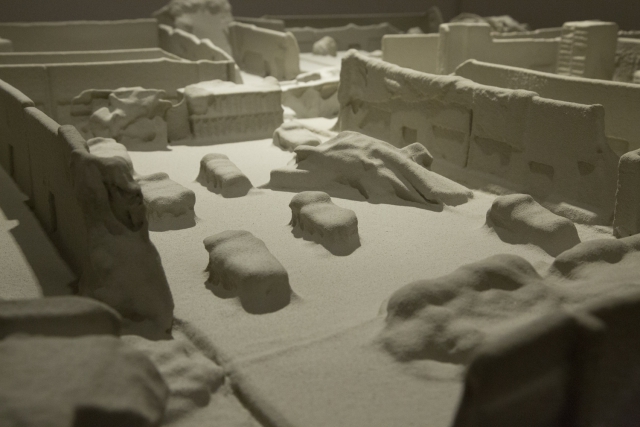 L’ultimo nucleo di lavori, presente in mostra, è composto da un paesaggio scultoreo tra il reale e l’utopistico, frutto di un procedimento marcato dall’esperienza, dai ricordi, dalla riscrittura di riferimenti immaginari e dalla sperimentazione sui materiali che compongono il bagaglio culturale dell’artista.