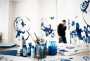 Dopo aver affrontato la lunga respirazione del segno nero su fondali bianchi, dopo aver inserito frangenti arteriosi di rosso tra le tramature dei segni neri, dopo aver affondato lo sguardo nel nero totale, Danilo Bucchi ritrova così con Blu la geografia del bianco su cui scorrono i fiumi del suo nuovo gemello cromatico: un blu minerale e boreale, scivoloso tra anse che si allargano e stringono, tra rivoli che schizzano e compattano la densità cromatica, tra curvature elastiche che ci fanno pensare al Pianeta visto dal cielo ma anche al microcosmo che l’occhio nudo non percepisce.