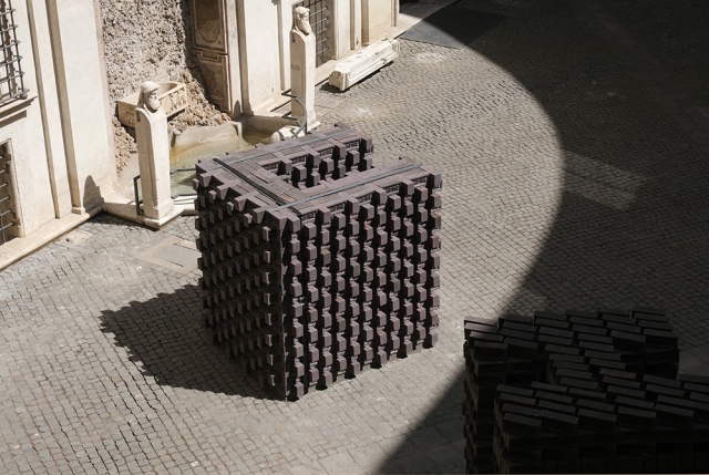 Il termine «impero», nelle sue varie e contrastanti accezioni, accende nell’immaginario collettivo figure di potenza e grandezza, e rievoca al contempo cupi scenari di coercizione, dominio e sottomissione. Ponendosi nel punto di snodo tra processi storici e memoria, tra valenze simboliche e politiche, linguaggio verbale ed esperienza visiva, Elisabetta Benassi torna a riflettere con questo progetto sul rapporto dialettico tra ieri e oggi. Come una sorta di dispositivo che produce configurazioni inattese, l’opera punta a sfidare l’idea di un’Antichità considerata ormai come un dato acquisito e a restituirla invece come intreccio conflittuale, punto di resistenza alla presunta ineluttabilità del presente. La natura site-specific dell’opera le permette di ridisegnarsi continuamente, in base al contesto e allo spazio in cui si inserisce. Di volta in volta EMPIRE può così evocare architetture fantastiche ed effimere, “castelli” o cataste simili a quelli eretti durante il processo di essiccazione dei mattoni, dai profili suggestivi ed enigmatici, o anche labirinti tridimensionali praticabili dallo spettatore, “cortine” e strutture disposte in configurazioni diversamente proporzionate, pensate per entrare in relazione con il contesto in cui l’opera va a inserirsi.