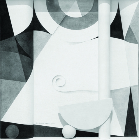 Monocromi dove è proprio la luce al centro del lavoro: luce cercata attraverso i contrasti di chiaro e scuro o, in particolare nelle opere tridimensionali (ma non solo in quelle), analizzata nella tradizionale funzione formale. La rappresentazione dello spazio attraverso la luce sottolinea, contraddice, stabilisce un rapporto dialettico con lo spazio reale e, non certo casualmente, la presenza del rilievo, l’emersione volumetrica degli elementi dal piano pittorico aprono a “teatrini” dove è, forse, possibile leggere la sottile linea di confine tra realtà e finzione.