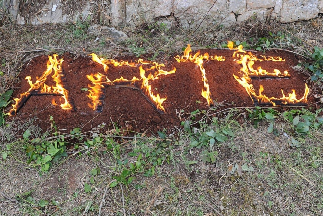 Fernando De Filippi torna a Martina Franca dopo le mostre personali del 1980 e 1983, e per questa nuova personale ha realizzato Arte e Ideologia un lavoro site specific. Le parole “Arte” e “Ideologia” bruciano sulla terra e su una lastra di ferro lasciando solo tracce che alludono alla trasformazione e al cambiamento di stato, non solo dal punto di vista di fenomeni fisici e fisiologici ma anche dal punto di vista emotivo ed esistenziale. Come per testi sulla spiaggia i meccanismi linguistici sono velocemente annullati. Il contatto – la funzione comprensiva, la volontà e lo sforzo necessari a capire e far capire – si riduce nel rifiuto del contatto, nell'annullamento del messaggio (parlare per non essere compresi). Il rapporto tra mittente e ricevente si riduce alla stessa persona o al gruppo che vive l'azione, che funziona nello stesso tempo da autore e spettatore unico dell'azione, determinando così un alternarsi e un confondersi dei ruoli. La negazione del segno/parola destina il messaggio e le sue potenziali possibilità linguistiche, alla clandestinità, negandosi come destinazione consueta e attivando nel contempo nuove possibilità di comunicazione. Il Fuoco è l’elemento che, mediante la sua energie, il suo perenne movimento, rende possibile ogni trasformazione, ogni cambiamento di stato e di forma tramutando il ponderabile in imponderabile, il materiale in immateriale.