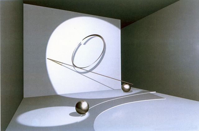 Si realizza in questo modo un gioco delicato e tutto cerebrale di interscambio mimetico continuo tra vero e falso, tra reale e virtuale, tra luci e riflessi, tra i segni e le loro ombre che descrivono tracciati continuamente confusi e intrecciati con quelli plastici di cui sono conseguenza.