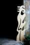 E dunque è nel legno, nella sua pelle viva, calda e liscia, che ha intagliato morbide curve e aperture, disegnando nella scultura Senza titolo, lingue che si ergono in alto e si richiamano oppure in Eccedo, in legno sagomato e acrilico, e in Drus, Achet, Yor, frastagliati e inaspettati contorni mentre esse stesse ci appaiono come il diventare uno di due diverse sculture, che ne fanno stranianti creature, personaggi di un immaginario mondo in cui si incontrano poesia e dimensione ludica.