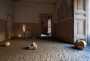 Il percorso della mostra si basa su due aspetti fondamentali: il sacro e il profano, appunto, e la creazione come rinascita dopo una catastrofe. Fin dalla soglia, che delimita gli spazi e che mette in comunicazione i due mondi, le pietre, calchi di argilla, sono simulacri che parlano della creazione dopo il nulla, forme che alludono al tempo mitologico della creazione di Pirra e Deucalione. L’artista crea così uno spazio, metaforicamente un temenos, un recinto sacro, come luogo dell’autopoieutica, ovvero di un sistema in cui ogni elemento collabora nell’autorappresentarsi, in un processo di trasformazione continua che include aspetti autobiografici, politici, culturali, biologici, mitologici, geografici, oltre a qualsiasi altro elemento contingenziale. Così pure il cono inscritto nel cerchio, un orizzonte in senso etimologico, che include all’interno di un limite. Questa forma riprende il verticalismo per alcuni versi della struttura di Tatlin, della torre costruttivista che, inclinata secondo l’asse di curvatura terrestre, proponeva un sistema semantico e ideologico alternativo a quello modernista e soprattutto la ri-costruzione della società.
