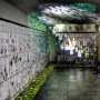 Da questa percezione del luogo, vivo perché vivo e attuale è il contributo dato all’arte dai grandi artisti citati, la Di Trani ha maturato il senso della sua installazione: tre muri di lapidi, ordinate, tutte uguali coi loro nomi scritti con gli stessi caratteri, macchiate a tratti di macchie verdastre di muffa, perimetrano tre lati dello spazio espositivo simulando l’affaccio sul grande giardino quadrato, costruito sull’area del convento camaldolese sul cui impianto fu edificato il cimitero monumentale di San Michele. Un’icona, questa, al cui stato di composta, malinconia e intima riflessione fanno eco le musiche originali di Luigi Parravicini,Composizione d’acqua. Alle immagini provocate visivamente da questo montaggio musicale realizzato registrando e rielaborando suoni e rumori di temporali, scrosci d’acqua, gocce di pioggia che cadono, mulinelli di torrenti e ruscelli, corrispondono i vari toni della voce, più acuti o più bassi in ragione dell’altezza dei suoni, con cui la Di Trani recita ritualmente ed in modo oracolare suoi versi onomatopeici ispirati al fluire dell’instabile e sfuggente elemento.